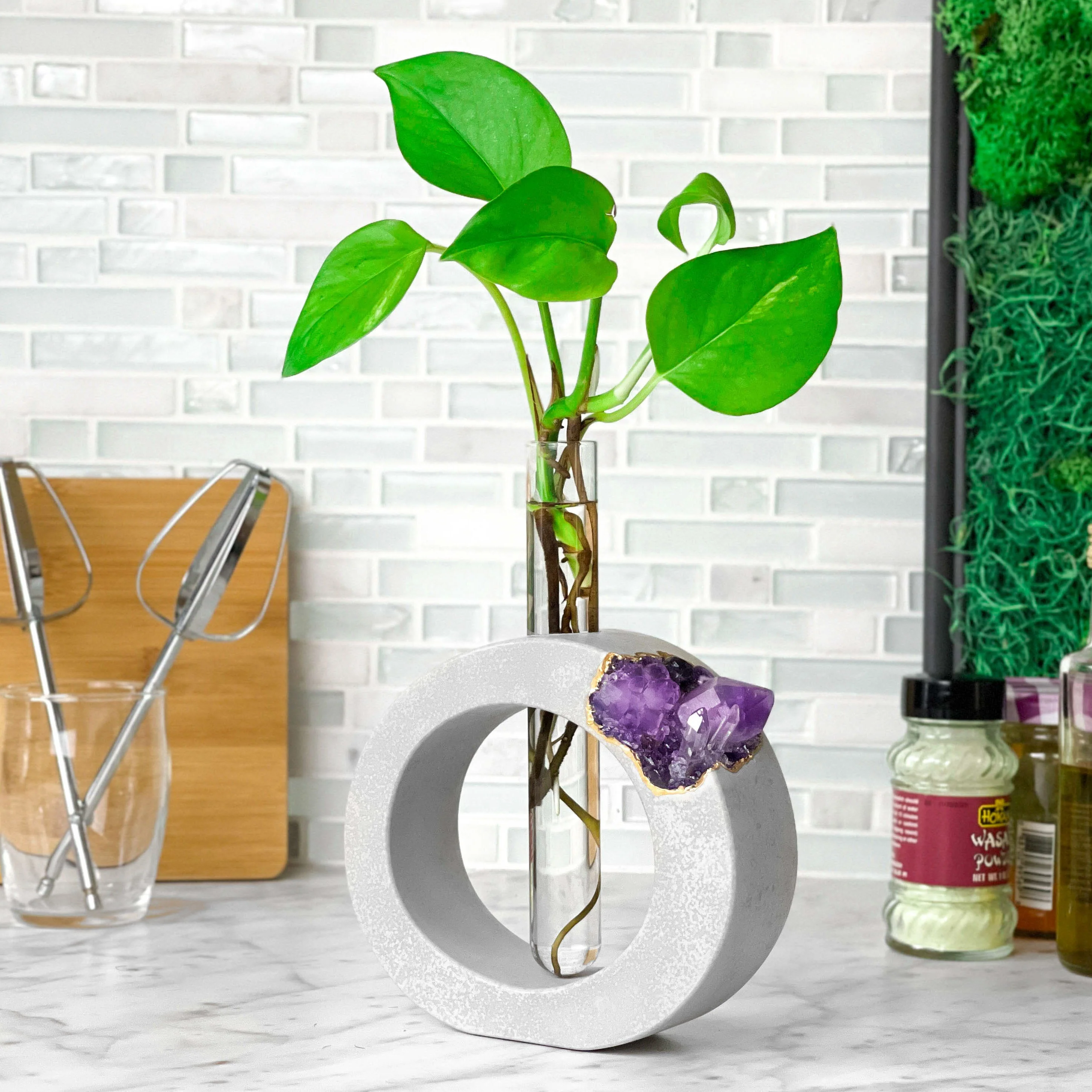 Give your plant babies a home that’s as beautiful as they are. This geode-inspired propagation station combines raw amethyst, clear quartz, and smooth concrete for a one-of-a-kind piece that’s part planter, part décor, part conversation starter. It’s the perfect blend of natural beauty and modern style — and yes, your cuttings will absolutely thrive in it.