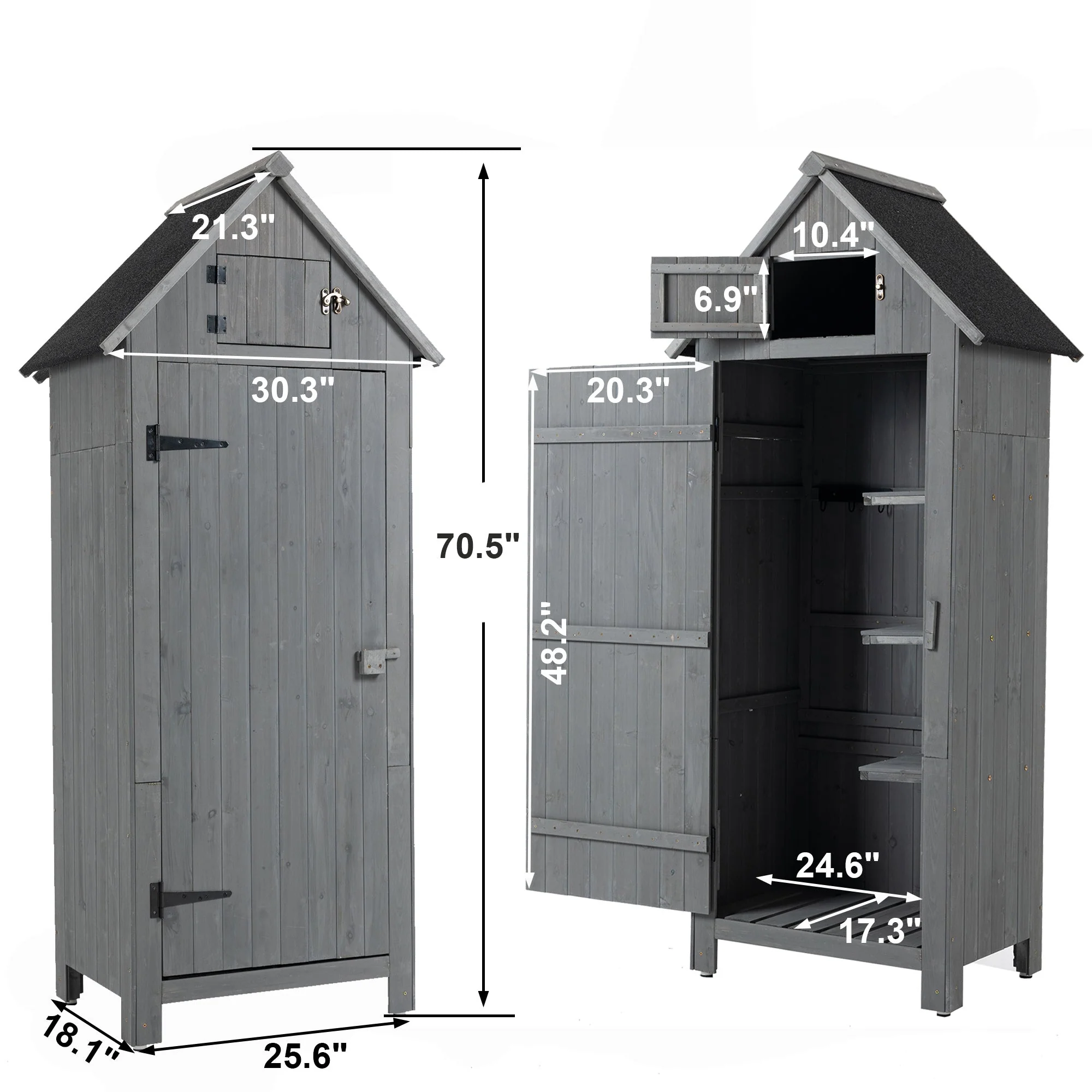 This sturdy fir wood shed has a timeless look and is designed for stability and convenience. It features a waterproof angled roof, a folding table with attached hooks, and ample storage space for garden tools.