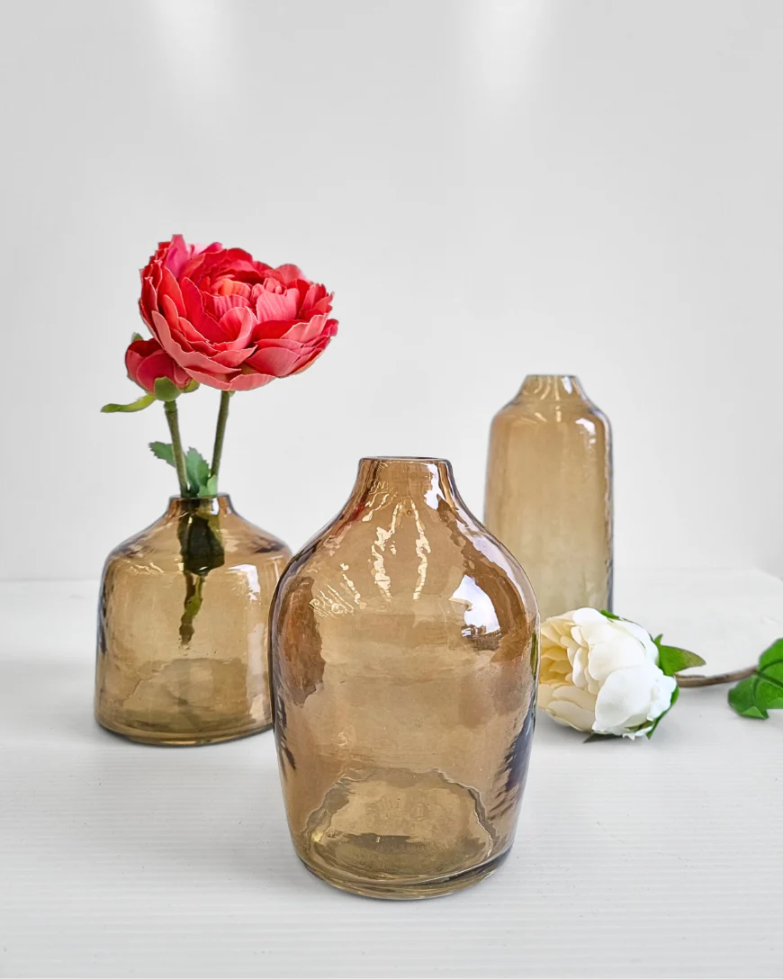 Introducing our exquisite collection of handblown hammered glass bud vases, a perfect blend of ethical craftsmanship and sustainable design. Each vase is meticulously hand-crafted from 100% recycled glass, offering a unique hand-hammered texture in three complimentary shapes. Ideal for showcasing a single bloom or a small bouquet, these bud vases bring a touch of subtle texture to any space while honoring a commitment to people and the planet. Our bud vases are sold individually so you can curate the perfect collection for your space.
