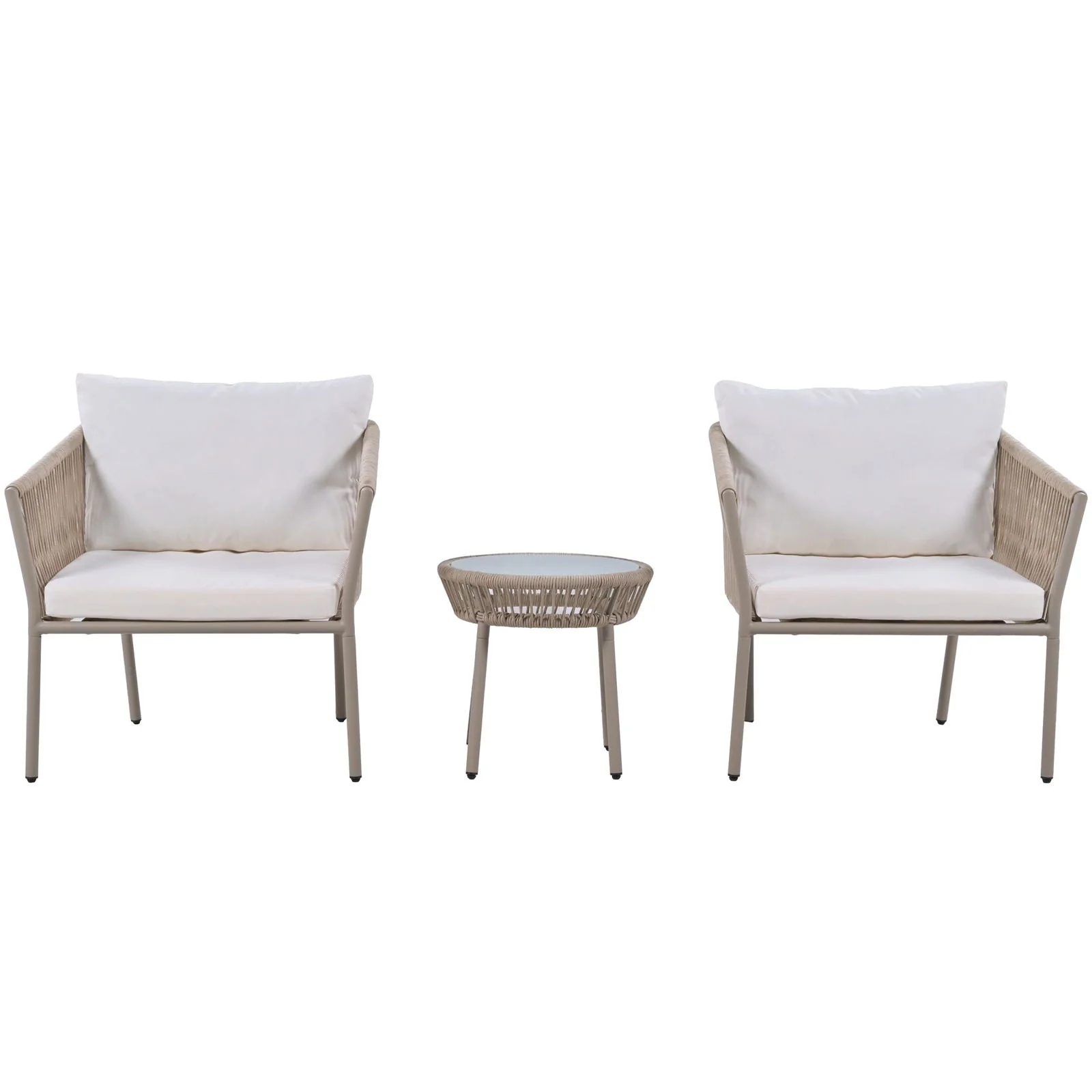 - Sophisticated Design: This set includes two single chairs and a sleek side table, all designed with a minimalist aesthetic that emphasizes comfort and style. The woven rope detailing and sturdy steel frame add a touch of elegance and durability.