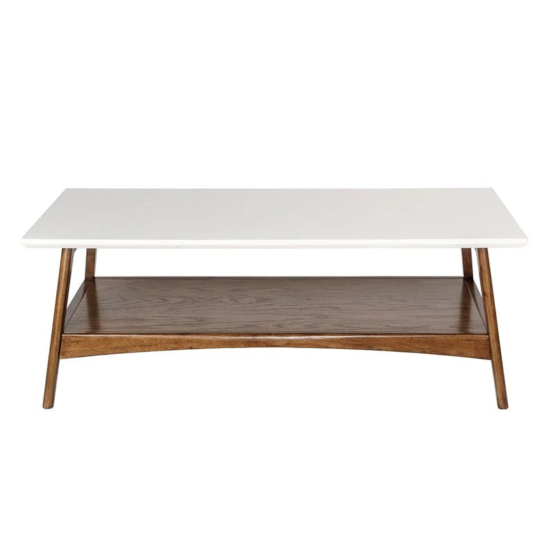 Add the bold Madison Park Parker Coffee Table to your living space. This all wooden mid-century inspired coffee table will go nicely with your living room decor. It features an off-white finish table top composed from manufactured wood, a solid wood frame, and a bottom shelf for extra storage space. The two-tone gives this table a striking contrast. Assembly required.